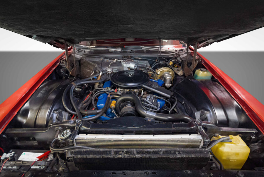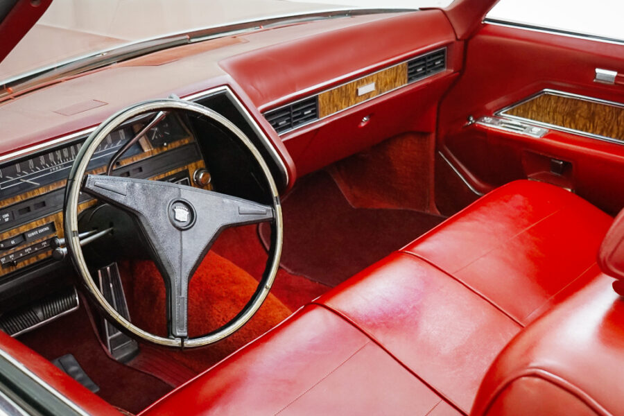 In 1970 a facelift included a grille with 13 vertical blades set against a delicately cross-hatched rectangular opening. The bright metal headlamp surrounds were bordered with body color to give it a more refined look. Narrow vertical “vee” taillights were seen again, but now had additional smaller V-shaped bottom lenses pointing downward below the bumper. Wheel discs and winged crest fender tip emblems were new.