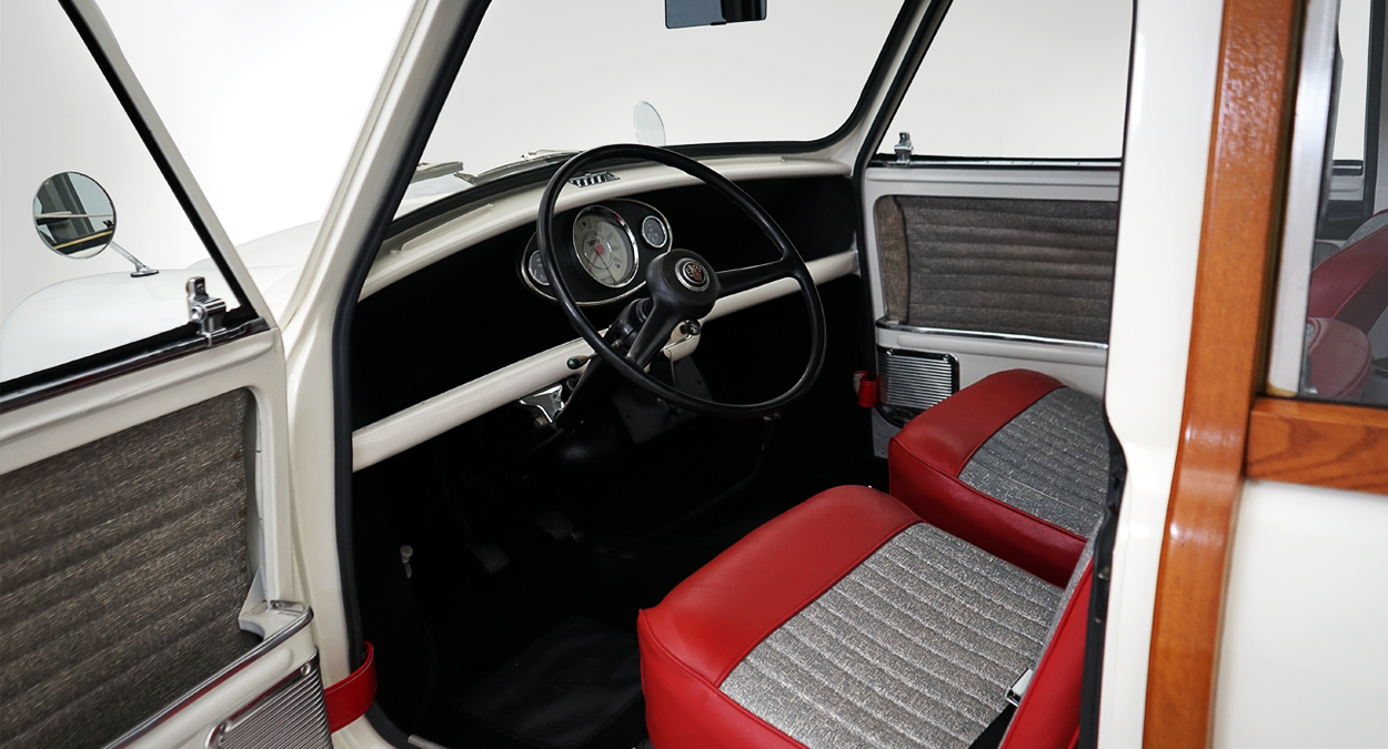 The left-hand drive Mini is powered by an 850cc A-series 4- cylinder engine, which might be small but “It’s part of the backbone of English motoring, which makes it quite hardy and boasts easy parts availability” the dealer says. “When matched with the four-speed manual transmission, the performance can be quite nippy,” he adds. “Add in a nice modern-tread tire and steering that is so exact it feels telepathic, and you’ve got in your hands all the reasons why people are passionate about driving a Mini.”
