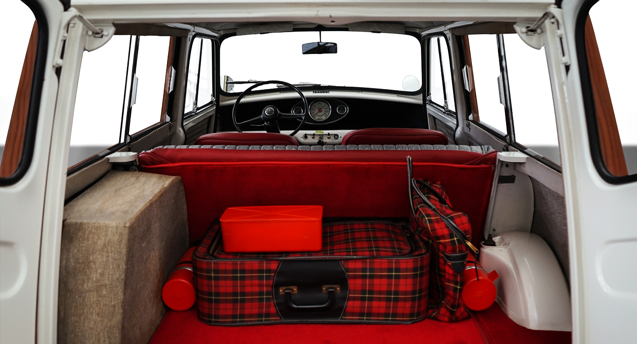 1961 Austin Mini Countryman, a longer-wheelbase version of the British staple was designed to expand cargo space and usability. Not to mention adding a touch of flair with its wood-framed cargo bed. The Austin Mini was an amazing critter, a tiny box on wheels with surprisingly roomy passenger space and agile drivability, which put many of them on racetracks competing against sports cars of the era. Like the Morris Minor wagon that went before, the Countryman, although not quite an actual woody, but a stylish representation of a pre-war shooting- brake. Shooting brake being synonymous with several other terms- “estate coach (GB)” or “station wagon (USA).” The double barn doors in the rear open to a stowage area that makes the Mini Countryman usable for business and vacation road trips.