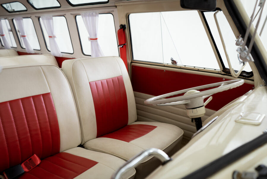 Dashboard controls are spartan, limited to just two gauges and a radio. The horizontally mounted steering wheel and flat front end delivers that bus-like vibe. The 1,500cc air-cooled, rear-mounted gas sipping engine is easy on the wallet and a blessing for drivers short on bread. The three-door + clamshell door configuration makes it easy for everyone to pile in for that journey to Woodstock. And when it’s time to air-out the inside, the split windshield props open.