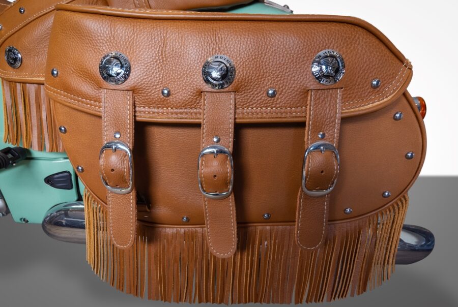 A beautiful motorcycle with Desert Tan Genuine Leather and plenty of fringe, the Chief Vintage is a classic bagger with soft leather bags and a windshield. The Thunder Stroke 111 motor moves things along smartly, while a tall windshield and triple headlights keep you comfortable and safe.